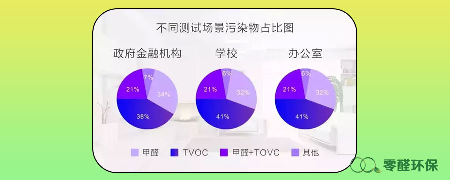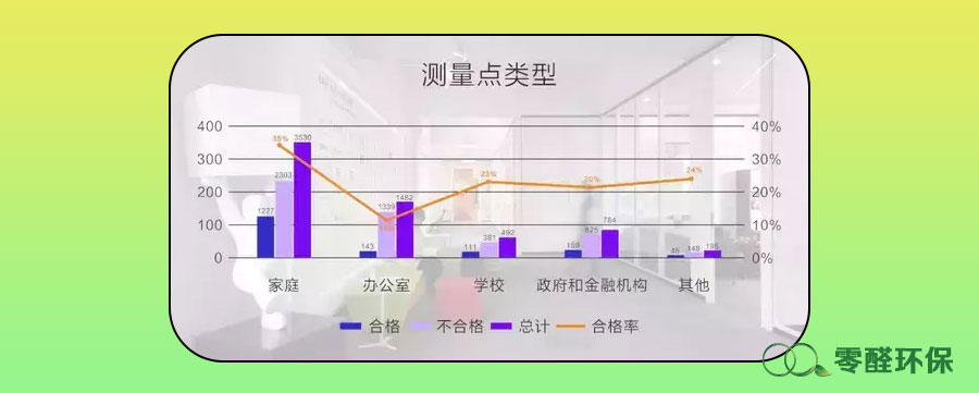 在家庭、辦公室、學校、政府和金融機構等場景的測量中,辦公室空氣質量不合格的比例最高,達到90%。測量的3530個家庭樣本,合格率為35%;784個政府和金融機構樣本,合格率為20%;492個學校樣本,空氣質量合格率為23%。